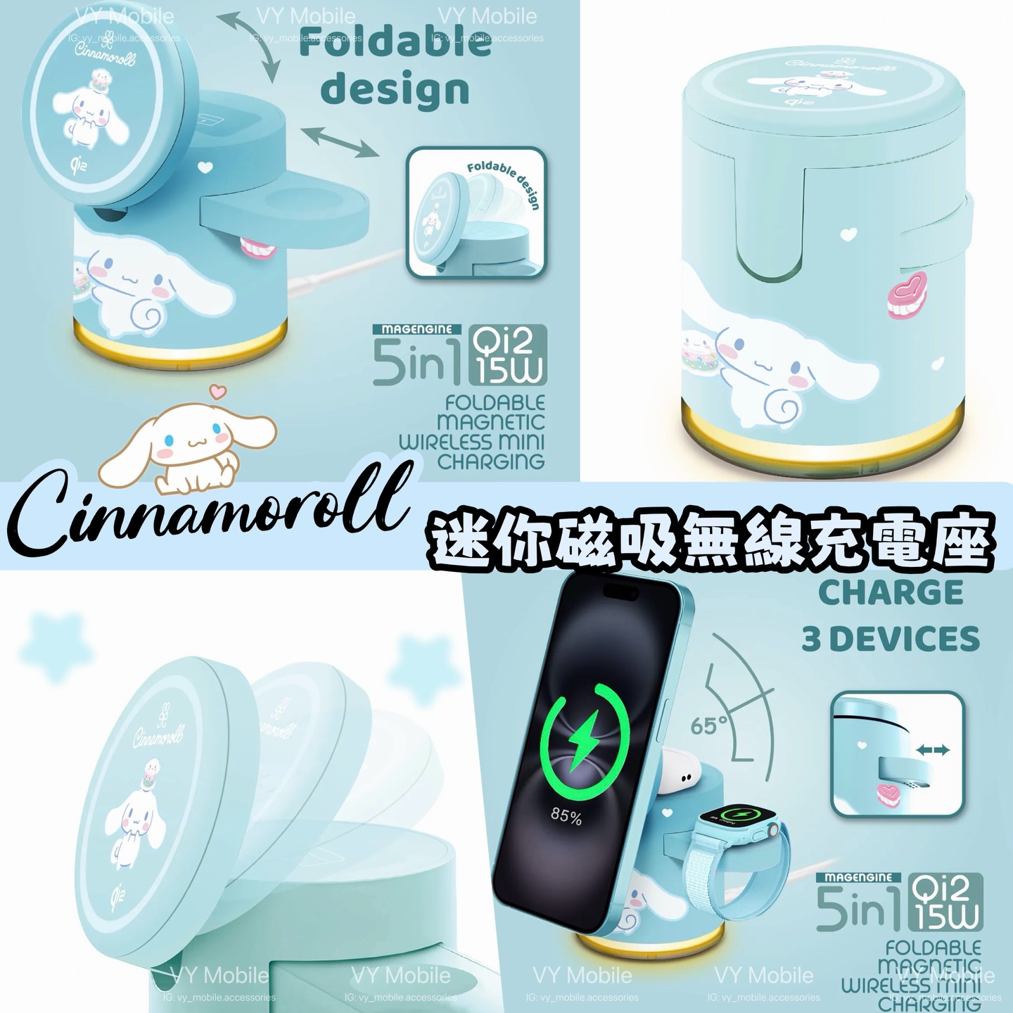 正版Sanrio Cinnamoroll Qi2迷你掌心 5合1 MagCharge 15W磁吸無線充電座